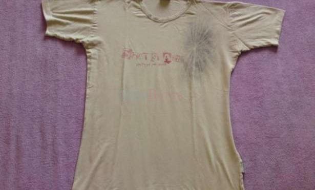 je bledo hnedej farby s nápisom, 95% viscon,5% elastén, cena bez poštovného 1,0eurá, na poštovnom sa dohodneme, je dosť nosené ale na doma alebo do práce je vhodné neni až v takom zlom stave